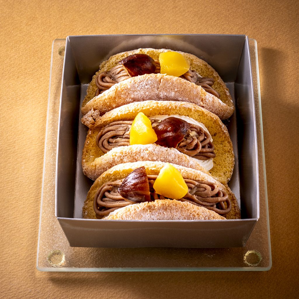 ふんわりと口どけ軽やかなオムレット生地に、こだわりの生クリームとコク深いモンブランクリームをたっぷり絞りました。仕上げに2種類の栗の甘露煮をトッピング。「空と大地」秋限定スイーツです。